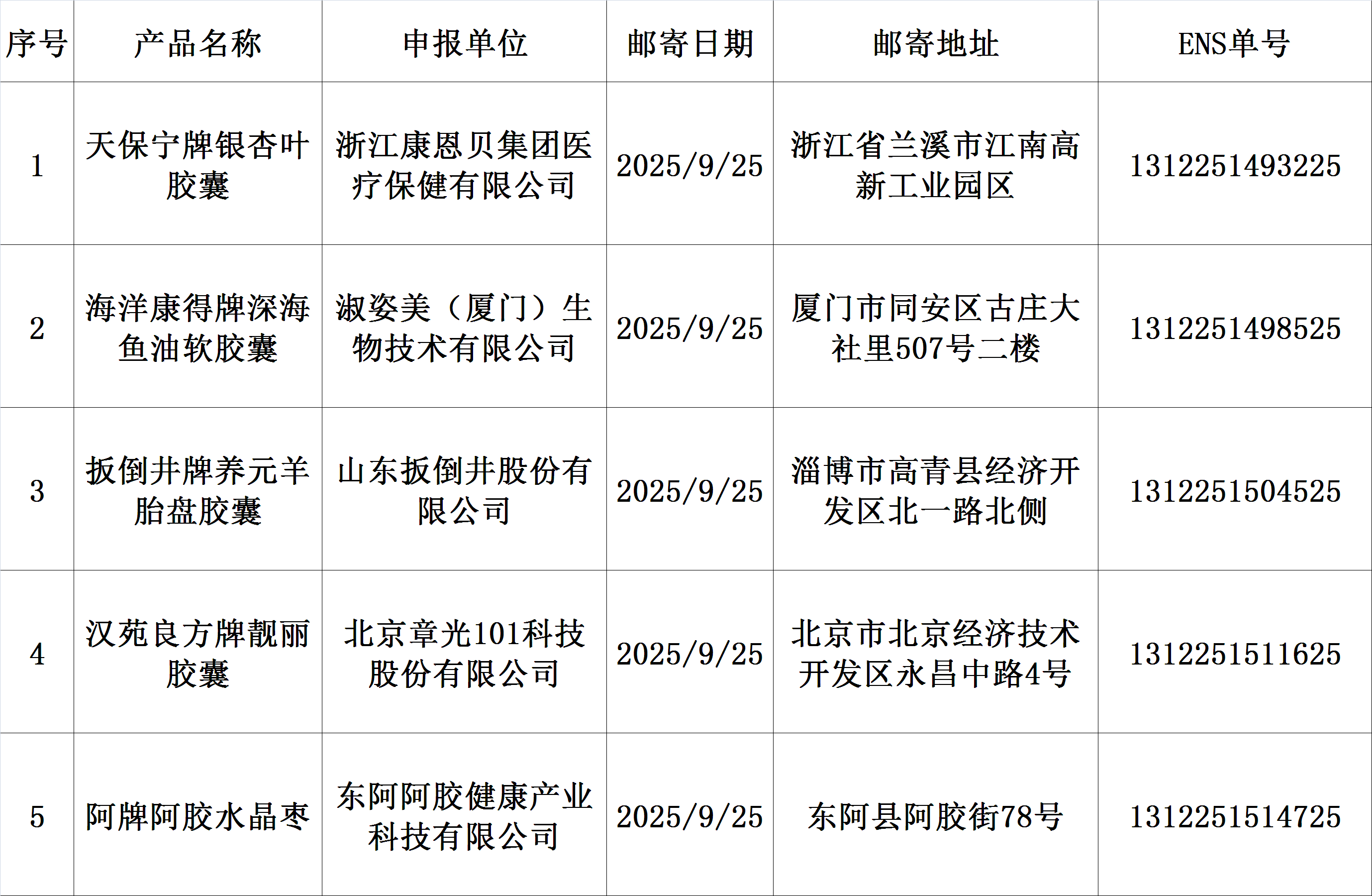 2025年9月25日保健食品批件(决定书)邮寄详情单